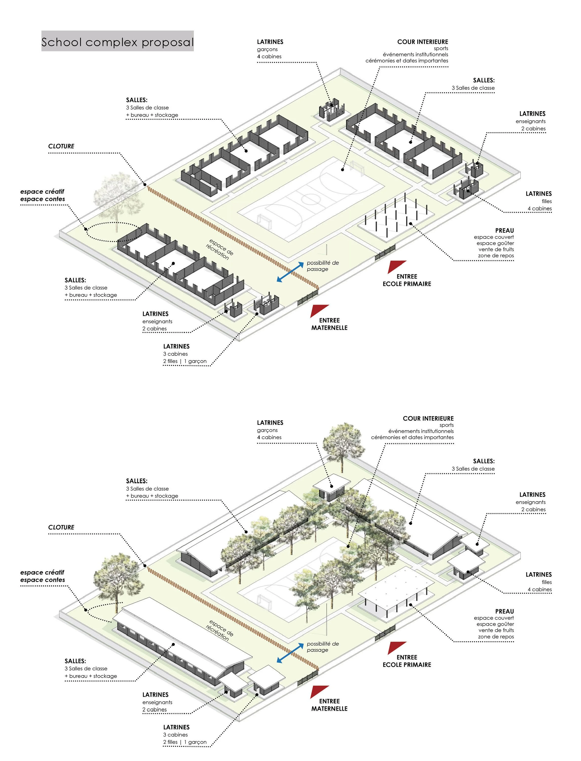 These diagrams only show the possibility of adaptation, flexibility and creativity. It is not intended to provide a fix plan. When designing multiple buildings, it is difficult to anticipate or provide a standard plan since it depends in which context the school located (urban or rural), topography and how many children will attend the school.